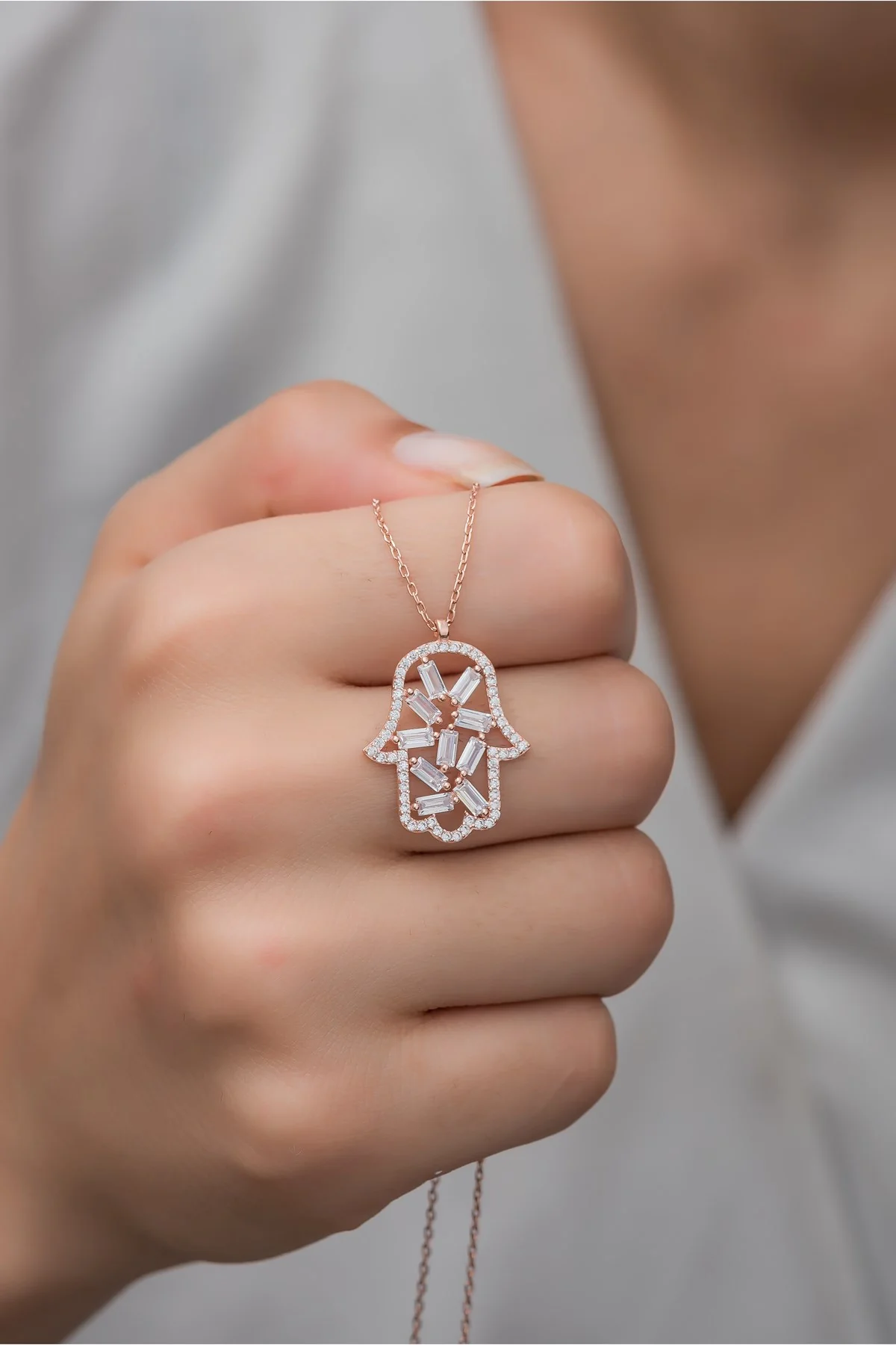 The Joud Zircon Hamsa Necklace is more than just a piece of jewelry—it's a symbol of protection, strength, and good fortune. Crafted in sterling silver and adorned with sparkling zircon stones, the Hamsa charm is believed to ward off negativity and bring blessings to its wearer. A meaningful piece with a touch of shine.
