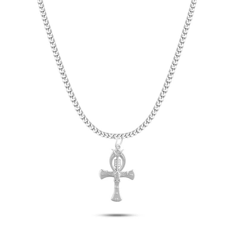 This everyday ankh pendant necklace has a shape of an eagle engraved on the pendant makes it essential layering piece , coupled with silver curb chain .