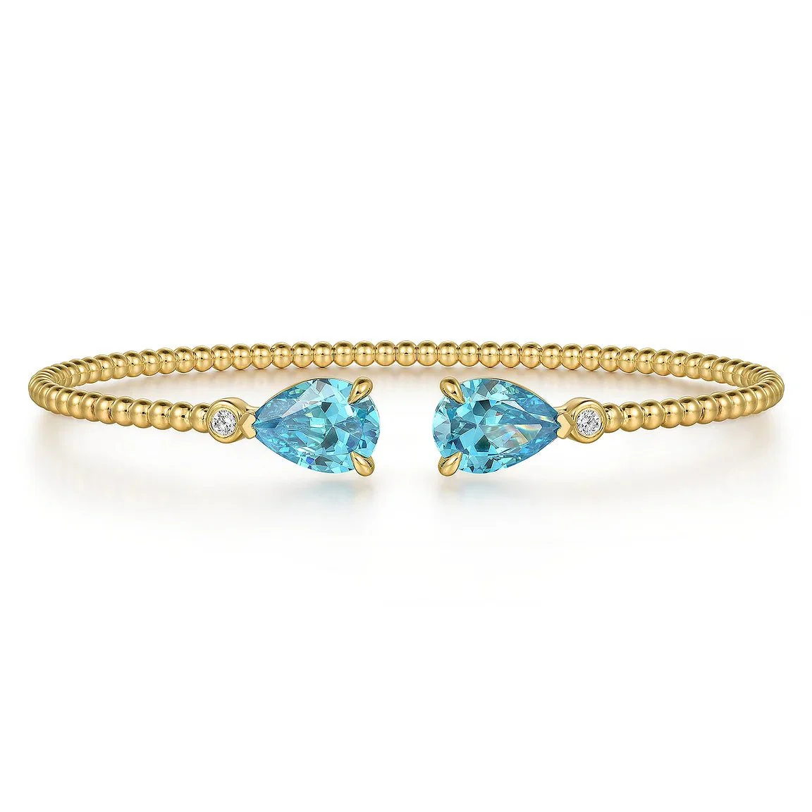 The Mermaid Aquamarine Bangle combines the eye-catching beauty of aquamarine stones with the effortless elegance of a beaded bangle. this bangle exudes a sense of sophistication and refinement. Elevate your look with this unique piece that pairs well with any outfit. This bangle features an adjustable, flexible design for easy wear. Perfectly complements its matching counterpart